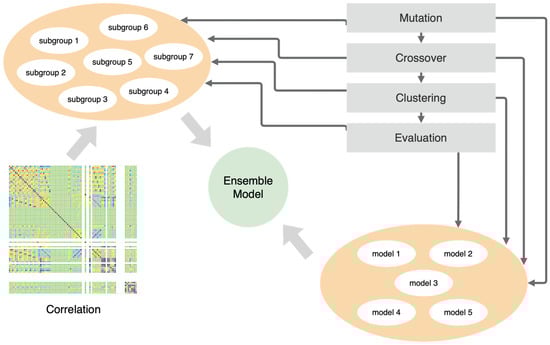 The framework starts with generating initial groups of input signals using correlation (this is explained in detail in the subsections below); then, it mutates models and groups via the genetic algorithm. In parallel, the genetic operators optimize the single models in each subgroup by making changes in the topology of the neural models (e.g., the length of the model and layer parameters). The final effect of these actions is an ensemble model optimized to detect anomalies. The ensemble model is defined as follows (where ):