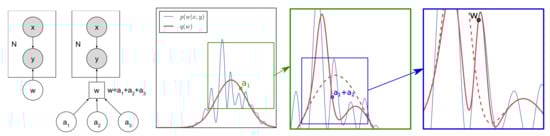 (Left) The supervised learning model and augmented model, respectively, where w is expressed as a sum of independent auxiliary variables. (Right) High level illustration of the refining algorithm. In each iteration, the value of an auxiliary variable is fixed, and the posterior is locally adjusted. In the final iteration, a sample is drawn from . Through the iterations, the variational distribution is able to approximate well the true posterior in a local region.