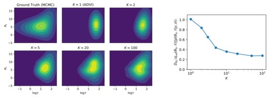 Figure 3 left shows the approximate posterior for various K values. At , the model is equivalent to ADVI, and as K increases, we can see that the refined posterior is able to capture the dependencies between and and results in a non-Gaussian form. The ground truth samples were obtained using the NUTS sampler in PyMC3 [,]. The density plots were generated using kernel-density-estimation.