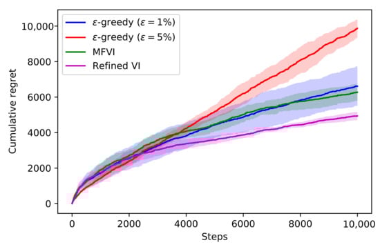 The performances of -greedy, Mean-field VI, and Refined VI on the mushrooms contextual bandit task. Lower regret is better. The mean and standard deviations are shown from 5 runs with different random seeds.