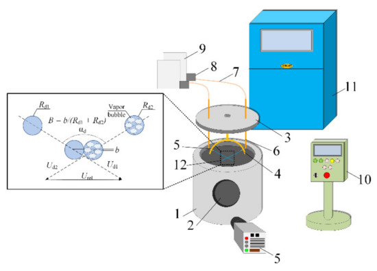 Schemes of setup and droplet collision parameter recording: 1—metal cylinder chamber; 2—observation window; 3—lid; 4—ring-shaped holder; 5—nozzles; 6—copper tubes; 7—silicone tubes; 8—pumps; 9—containers with liquid; 10—induction heater control panel; 11—liquid cooling system; 12—recording area.