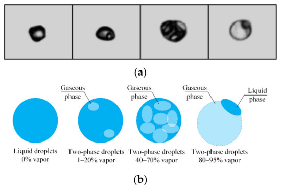 Video frames (a) and schematic image (b) of droplets with different relative volume fraction of vapor bubbles in them.