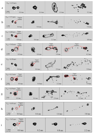 Some specific aspects of collisions of droplets with bubbles and without them are also noteworthy (Figure 3g–i). When a liquid droplet is significantly smaller than a two-phase droplet, the former is highly likely to stick to the surface of the latter because the smaller droplet slows down on the surface of the larger droplet due to its elastic compression. Yet at a relatively high velocity (over 3–4 m/s), the smaller droplet may penetrate the vapor bubble or destroy it (disruption). When the two-phase droplet is significantly smaller than the liquid droplet, it is usually destroyed after the collision. When two-phase and homogeneous droplets have comparable sizes, the collision regime depends largely on the relative velocity. The higher this velocity, the more often disruption occurs. It is also clear from Figure 3g–i that with the growing ratio of the size of the liquid droplet without vapor to that of the droplet with vapor, the number of secondary fragments resulting from the disruption of the initial droplets decreased. These secondary fragments were highly heterogeneous in terms of their component composition (i.e., the video frames clearly show the content of water and bubbles) (Figure 3c,d,f).