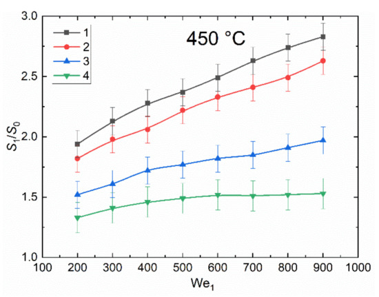 The ratio of the free surface area of liquid before and after the interaction of droplets with different proportion of vapor bubbles vs. the Weber number (We1), calculated for the water droplet: 1—two droplets without vapor; 2—a droplet without bubbles and a droplet with about 10% vapor; 3—a droplet without bubbles and a droplet with about 60% vapor; 4—a droplet without bubbles and a droplet with about 90% vapor.