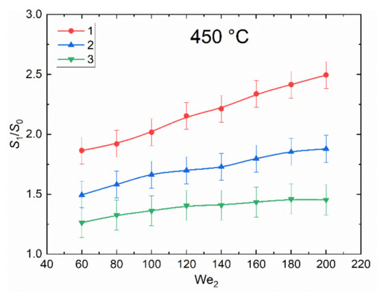 The ratio of the free surface area of liquid before and after the interaction of droplets with different proportion of bubbles vs. the Weber number (We2), calculated for the two-phase droplet: 1—a droplet without bubbles and a droplet with about 10% vapor; 2—a droplet without bubbles and a droplet with about 60% vapor; 3—a droplet without bubbles and a droplet with about 90% vapor.