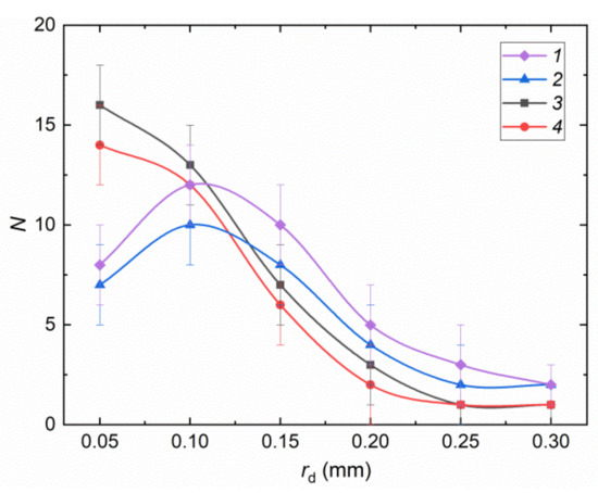 The distribution of liquid child droplets is presented in Figure 6. In the vast majority of the conducted experiments, when droplets with B > 0.2 collided, they broke up to produce a chain of different-sized secondary fragments. In this case, the child droplets of all the liquids under study were represented by two relatively large fragments (rd > 0.3 mm) and several small ones (Nti = 2–9). The distribution extremum was attained near the value rd = 0.1 mm. The number of droplets with rd = 0.15–0.3 mm ranged from 15 to 30. The secondary fragment distributions obtained suggest that the relative fraction of vapor in droplets may be used as the initial parameter for varying child droplet characteristics together with B and We.