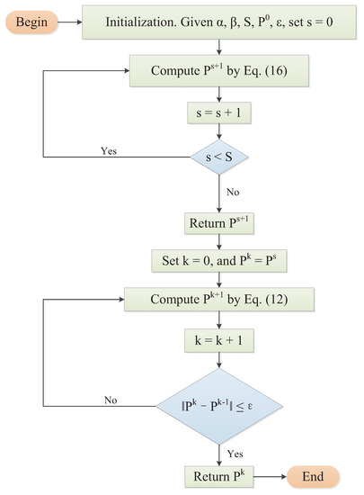 The iterative result of Equation (16) can be used as the initial estimate of Equation (12). Then, iteration using Equation (12) is repeated until the regularized solution of Equation (11) is found. Consequently, Equations (12) and (16) can form a stable, globally convergent and fast method, as described in Algorithm 1. The flowchart of Algorithm 1 is shown in Figure 1.