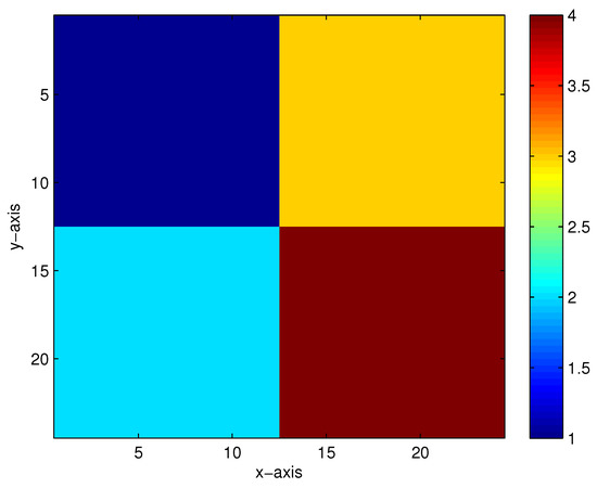 Let be the unit square, and after the finite difference discretization, Equation (19) turns into
