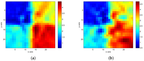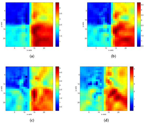 In order to study the sensibility of the inversion results on the parameters , , , we use the homotopy method with constraints for the first model with 15% Gaussian noise added, test several values of , , and list the relative errors in Table 5. From Table 5, it can be seen that the performance of the proposed method is highly sensitive to the values of and and insensitive to the value of . Usually, the optimal regularization parameter is unknown and must be determined by methods such as trial-and-error, cross-validation, L-curve criterion, the discrepancy principle and others. In this paper, we determine the parameters and by trial-and-error, for the sake of simplicity. From Table 5, we find that the constraint parameter performs best, that the regularization parameter performs best and that the value of initial estimate does not affect the inversion result; thus, we let , . It is because of the global convergence property of the homotopy method that the value of initial estimate can arbitrarily be chosen. In fact, the value of is chosen from range of 0 to 10, since the permeability values are from range of 0 to 10 in reality. The value of is usually chosen to be the mean value 5 of 0 to 10, when no prior knowledge is available about the permeability parameter.