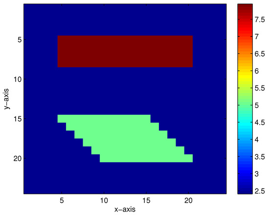 The first true model is displayed in Figure 2. When there are 5%, 10%, 15% and 20% Gaussian noises in the measurement data, the inversion results of the homotopy method with constraints and the homotopy method without constraints are shown in Figure 3 and Figure 4, respectively. When the noise level reaches 15% or 20%, the inversion result is still satisfactory for the homotopy method with constraints (see Figure 3c,d); however, the homotopy method without constraints is not convergent.