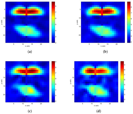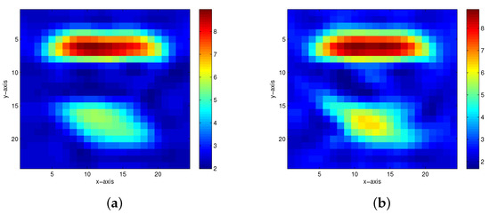 The second true model is the model of two anomalous bodies in a homogeneous medium, as shown in Figure 5. Figure 6 and Figure 7 show the inversion results of the homotopy method with constraints and the homotopy method without constraints, respectively, with the noisy data at 5%, 10%, 15% and 20%. Figure 6c,d show the inversion results of the homotopy method with constraints when 15% and 20% Gaussian noises are added to the measurement data, respectively. If the same noise level is used, the homotopy method without constraints is divergent.