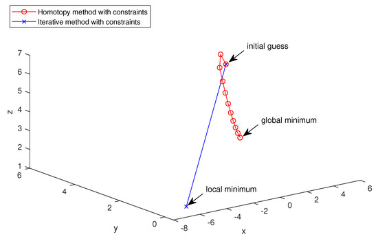 In order to pictorially demonstrate how the homotopy method avoids the local minimum, we use the homotopy method with constraints and iterative method with constraints for the first model with no noise. Three locations , , of the parameter model are selected as the coordinates of three-dimensional plotting. The true parameter values of these locations are 1, 2 and 3, respectively, so the global minimum is . , so the initial guess is . Figure 8 pictorially shows how the homotopy method with constraints converges to the global minimum from the initial guess and how the iterative method with constraints converges to the local minimum from the initial guess .