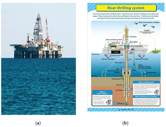 Submarine oil exploration. (a) Offshore oil operation platform. (b) Riser drilling system.
