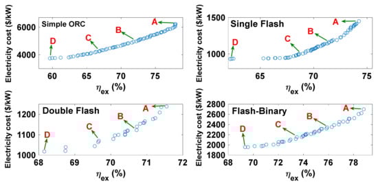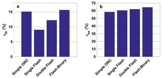 Calise et al. [12] performed exergetic and exergoeconomic assessments of a hybrid renewable system that includes geothermal and solar energies as heat resources. Their results showed that the exergy efficiency varies between 40% to 50% in the winter, and 16% to 20% in the summer. Shamoushaki et al. [13] carried out energy, exergy, exergoeconomic, and environmental assessments of a solid oxide fuel cell and gas turbine (SOFC-GT) system. They carried out multi-objective optimization of the considered system with the non-dominated sorting genetic algorithm II (NSGA-II). Fiaschi et al. [14] performed exergy and exergoeconomic analyses of low and medium temperature geothermal plants in Italy. They showed that the system with R1233zd (E) as the working fluid has the best exergoeconomic performance among the considered cycles. Bianchi et al. [15] studied a micro-ORC case study using geothermal energy, and showed that the expander and feed pump efficiencies and the ORC efficiency at the geothermal well-working conditions were 53%, 41%, and 4.4%, respectively. Behzadi et al. [16] conducted thermodynamic and exergoeconomic assessments of an integrated energy system with geothermal and solar heat resources. They performed a multi-objective optimization of this system, considering exergy efficiency and total product unit cost as objective functions.