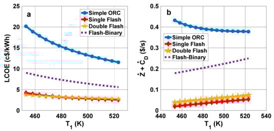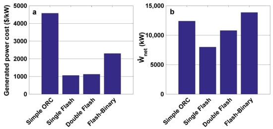 Zare [8] assessed and compared three organic Rankine cycle (ORC) configurations for binary geothermal power plants from thermodynamic and economic viewpoints, finding that an ORC with an internal heat exchanger has better thermodynamic performance than other configurations. Yari et al. [9] carried out thermodynamic and exergoeconomic evaluations of a trilateral power cycle, and compared the results with those for ORC and Kalina cycles. Their results showed that the trilateral Rankine cycle net power is higher than that for the other considered cycles. Shokati et al. [10] analyzed and optimized various geothermal configurations, such as basic, dual-pressure, dual-fluid ORC, and Kalina cycles, from exergy and exergoeconomic points of view. They showed that the turbine in the basic and Kalina cycles, and the low-pressure turbine in the dual-pressure and dual-fluid ORCs, have the highest total cost rates. Zhao and Wang [11] performed an exergoeconomic analysis of a flash-binary geothermal cycle and its optimization, as well as a parametric evaluation of impact on system performance of varying such parameters, as flash pressure, ORC turbine inlet pressure, and ORC turbine inlet temperature.