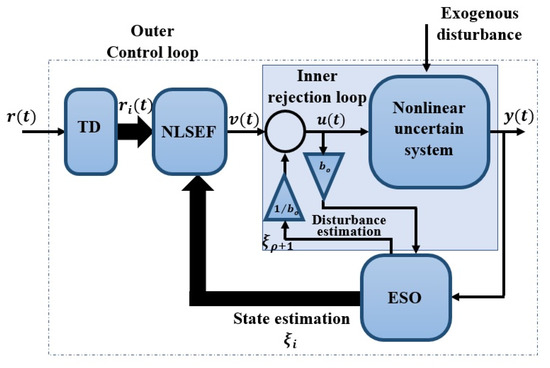 The basic principle of the Active Disturbance Rejection Control (ADRC) lies in estimating in a real-time manner the system dynamics along with “generalized disturbance” [31], which includes all the undesirable system uncertainties and external disturbance by using ESO. The ESO is the main unit of the active disturbance rejection control (ADRC) [32]. The ADRC includes an ESO, a Nonlinear State Error feedback (NLSEF), and a Tracking Differentiator (TD) as shown in Figure 2. where is the reference signal, is the transient profile, is the relative degree, is the gain of the control input, is the extended observed vector which involves the predicted generalized disturbance and predicted states of the system, and is the control input. Tracking Differentiator (TD) which is used to generate the transient profile of the reference input (i.e., the noise-free signal itself together with its − 1 derivatives).
