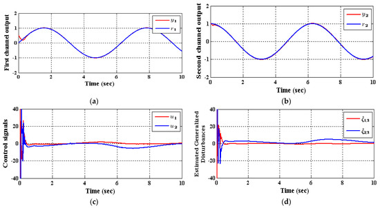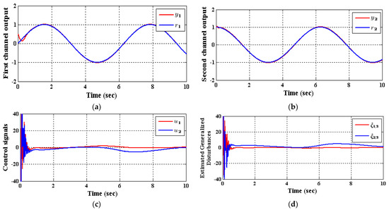 Consider that the reference signals and the external disturbance are given as: The states initial values are assumed as: . Two ADRC scenarios will be adopted in the simulations. The dissimilarity among them is the kind of extended state observer (ESO) adopted to observe the system’s states and the generalized disturbance. The first configuration is the Conventional ADRC (CADRC), which involves a conventional TD described by [29],