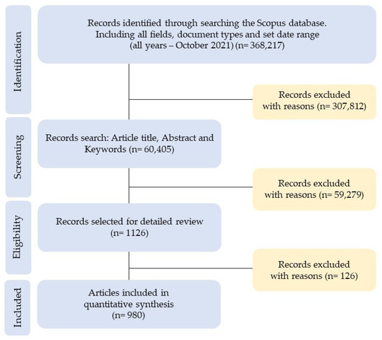 - Included: The data referring to the “all years–2020” period were selected, that is, from the first article on the research topic (1974) to the last full year (2020). In this last phase, of the 1126 records, 146 documents were excluded, so the final sample included 980 articles, both open access and non-open access.