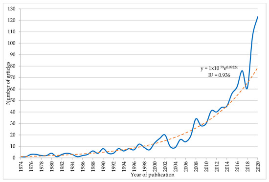 Figure 2 shows the evolution of scientific production at a global level during the period 1974–2020 in the topic of research. The trend line was exponential and showed its goodness of fit with an R2 of 0.936, referring to the proportion of the variance in the dependent variable (number of articles) that is predictable from the independent variable (year of publication). Therefore, the curve represents that the number of articles on the subject of the study increased more rapidly over time.