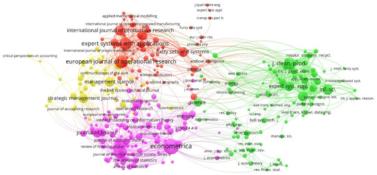 The total of 980 articles were published in 370 journals, according to the Scopus database. Figure 3 shows the network map of the journals that were published on the business information–entropy correlation in the accounting process of organizations at a global level, based on the co-citation method.