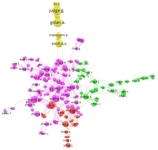 Figure 4 shows the map of cooperation between the authors based on co-authorship analyses that they published around the world on business information–entropy correlation in the accounting process of organizations. The authors were associated in five clusters. The color of each component is linked to the group of associated authors. The diameter of each circle indicates the number of articles by the author. The network showed a great dispersion in the association of authors during the period analyzed (1974–2020).