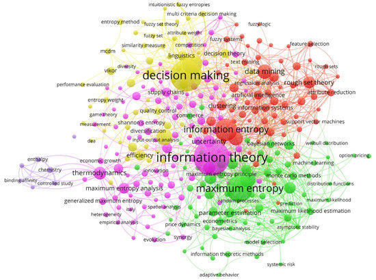 The keywords most used in the works carried out by the main authors of this topic are associated with the search terms “entropy” (maximum entropy, maximum entropy in the mean, maximum entropy generalized, social entropy theory, Dirichlet process, relative entropy, computable general equilibrium (CGE), controlled stochastic process, aleatory and epistemic uncertainties), “accounting” (costs, decision-making, decision support systems, decision systems), “information” (aggregated information, incomplete information, knowledge-based systems, information theoretic methods, information theory, Kullback–Leibler information, Bayesian estimation, Bayesian learning, behavioral research, censored data), and “business” (business excellence, commerce, economic conditions, triple helix, adaptive behavior, living system).