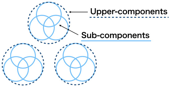 In the second aspect, we consider how to summarize the merging results quantitatively. After merging mixture components, we obtain two types of clustering structures; those among the upper-components and those among sub-components within each upper-component, as illustrated in Figure 2. These structures might be still ambiguous because the upper-components are determined to be the different clusters, but they may overlap; the sub-components are determined to belong to the same cluster, but they may be scattered in the cluster. Therefore, we need to evaluate the degree to which the upper- and sub-components are discriminated as different clusters. We realize this using the notions of mixture complexity (MC) [7] and normalized mixture complexity (NMC). They give real-valued quantification of the number of effective clusters and the degree of their separation, respectively. We therefore develop a novel method for cluster summarization.