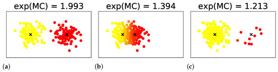 where denotes the weights of the data , denotes their sum, and is redefined as . Examples of MC for mixtures of two components are shown in Figure 3. In them, the exponential of the MCs take values between 1 and 2, according to the uncertainty in the number of clusters induced by the overlap or weight bias between the components.