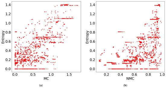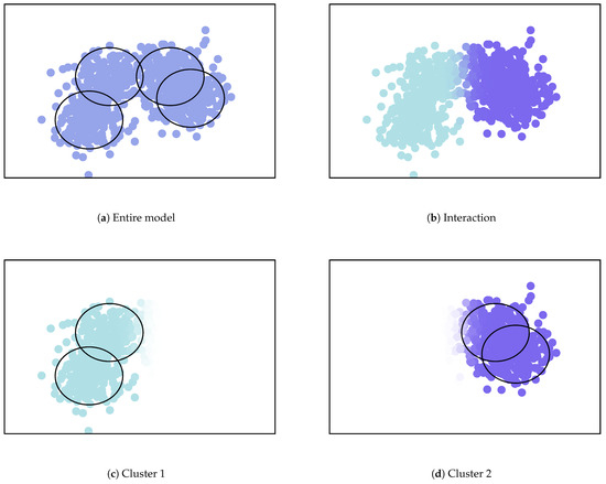 We show an example of the clustering summarization using the mixture model illustrated in Figure 4. In this example, there are four Gaussian components as illustrated in Figure 4a, and two merged clusters on the left and right sides as illustrated in Figure 4b–d. The clustering summarization is presented in Table 2. For the upper-components, the exponential of MC is almost two, and the NMC is almost one. This indicates that two upper-components can be definitely regarded as different clusters. For both sub-components, the exponential of MC is larger than one. This indicates that they have more complex shapes than a single component. Moreover, the structures within Component 1 are more complex than those in 2, because the MC and NMC are larger.