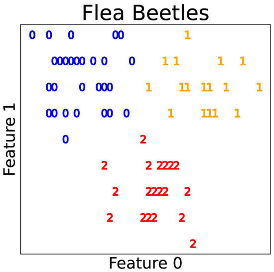 The Flea beetles dataset [37] consists of two physical measurements (width and angle) of flea beetles. Three cluster labels are the different species, named Concinna, Heikertingeri, and Heptapotamica.
