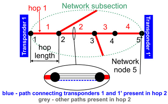 Data preparation process is depicted in Figure 1. In order to better understand the meaning of the various database attributes presented later in the subsection, in the context of DWDM technology, an example DWDM network topology is shown in Figure 2. Figure 3 illustrates the concepts of network node, hop, hop length, path, and transponder. The dataset contains 107 optical paths, 3 of which correspond to unsuccessful designs (“bad”) and rest of them (104) are operational (“good”).