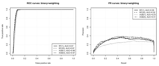 Figure 4 presents the ROC and PR curves obtained for binary classification with instance weighting. The numbers in the parentheses after algorithm acronyms in the plot legends specify the minority instance weight value. For readability, only the results without weighting and with the best weight value are included. All the observed differences are statistically significant according to the bootstrap test except for those between RF(1) and XGB(5), and between RF(20) and XGB(5). One can observe that:
