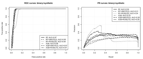 Figure 5 presents the ROC and PR curves obtained for binary classification with synthetic instance generation. The numbers in the parentheses after algorithm acronyms in the plot legends specify the minority class size multiplication coefficient. For readability, only the best results obtained when using SMOTE and ROSE are included and the results with no synthetic instance generation as a comparison baseline. All the observed differences are statistically significant according to the bootstrap test. One can observe that: