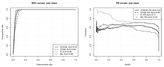 The ROC and precision-recall curves for one-class classification are presented in Figure 6. All the observed differences are statistically significant according to the bootstrap test except for the one between IF and OCNB. One can observe that: