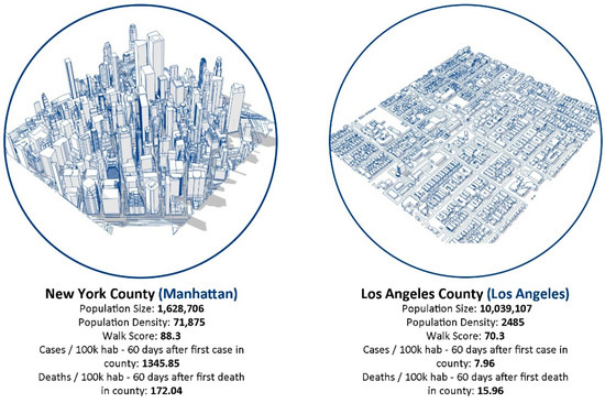 The novel coronavirus pandemic has significantly changed the way people interact with each other and with urban space. As there are no fully immunized cities yet, there is scientific consensus on the importance of adopting social distancing strategies to control the spread of COVID-19, especially in areas of high transmission rates or low vaccination rates [1,2,3,4]. Over time, many significant, increasing, and competing issues have arisen from implementing aggressive social distancing measures versus preserving socioeconomic activity. In this regard, there is a knowledge gap regarding how urban environments’ characteristics impact the spread of COVID-19 and infectious diseases in general. There is also a lack of, and an urgent demand for, data-driven approaches that can support decision-making related to these issues for different urban scenarios. The COVID-19 pandemic and all the complex data it generates point to the simple fact that contact leads to infection, and more face-to-face interactions are likely to increase transmission [1,3,4]. In this sense, cities are the stage where contact between people, and therefore infection, is more likely to occur. Although individuals and community behaviors such as how different groups choose to mask, stay home, get vaccinated and take other preventive measures also influence contagion spread, the available data indicates varying patterns of the spread of COVID-19 within American cities, especially in the first months when the contagion was faster in high-density and more walkable counties such as New York than in low-density and car-oriented counties such as Los Angeles (Figure 1). Thus, if an understanding is developed as to how urban features are correlated to different modes of social interaction and, consequently, to different patterns of COVID-19 spread, it will assist the identification of appropriate strategies to contain and mitigate the infection.