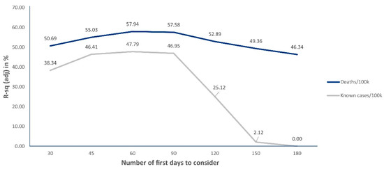 Instead of addressing a single and national timeline, considering the day of the first case in the United States as day one for all counties, we decided to study how the disease spread in diverse locations to identify how different urban features and associated urban patterns correlated. Our logic considers each county, regardless of their particularities, as a preliminary token to understand the whole country. To overcome potential bias in the timing of the disease’s onset across locations, we addressed the time-adjusted number of known cases and deaths per 100 k inhabitants in the studied counties. To this end, we considered two time-lapses for each county: 60 days after the first case (when addressing cases per 100 k hab) and 60 days after the first death (when addressing deaths per 100 k hab). The goal was to observe the longest time span possible and, at the same time, focus on spread in initial stages (when we assume that containment measures had less time to exert influence), allowing us to identify the effects of urban features more clearly. We used the software Minitab to run the analysis and the Grasshopper plugin for Rhinoceros was used for plotting some of the visualizations. Preliminary model fitting studies, carried out to identify the most suitable time interval, indicated the first 60 days as the best choice. After the first 60 days, both for cases and deaths per 100 k habitants, our R-squared adj values started to decrease significantly, as depicted in Figure 2.