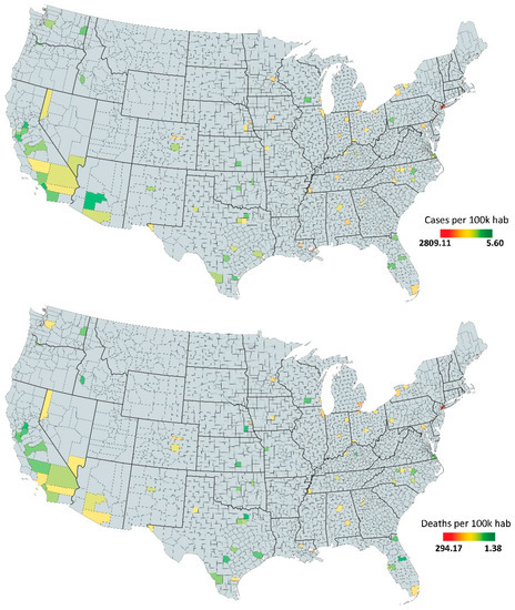 According to [10], urban areas are the ground zero of the COVID-19 pandemic, responsible for 90 percent of reported cases before and during April 2020. The United States, in turn, was the number one country in the world in terms of COVID-19 cases and deaths as of 15 March 2021. From 21 January 2020 to 28 April 2020, 1,006,417 confirmed cases and 57,433 deaths were reported in the U.S.