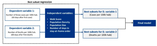 Thus, in this work, we adopt the (BSR) to test all possible combinations of the independent variables and select the best model according to goodness-of-fit criteria [46,47,48]. Since we are approaching a social and behavioral data analysis using multivariate regression, we are also interested in understanding the role of our potential predictors (independent variables) in the dynamics of disease spread. Thus, we adopted a correlation analysis, followed by a best subsets regression to determine which of our candidate independent variables (walk score, population density, population size, and the number of days in stay-at-home order) should be considered in our final regression model. This procedure was performed to build two regression models for comparison: one considering the number of cases per 100 k habitants 60 days after the first case in each county and the other considering the number of deaths per 100 k habitants 60 days after the first death in each county. We also performed an analysis considering population size data in its log-transformed state, but the model presented in this paper had a greater r. The goal was to use best subset regressions in the number of known cases per 100 k hab and deaths per 100 k hab against our set of independent variables to determine the most significant dependent and independent variables. Figure 4 illustrates our workflow for selecting the best regression model using the best subsets regression. Thus, we are approaching two conflicting considerations: minimizing the number of predictors to achieve a less expensive model and maximizing the model’s explanatory power. In addition to the regressions, we made a multivariable comparison between the counties with the higher and lower number of confirmed cases and deaths per 100 k habitants. These analyses generated preliminary findings that address the following questions: Which urban features matter most? Which can we ignore? How do urban features interact with each other?