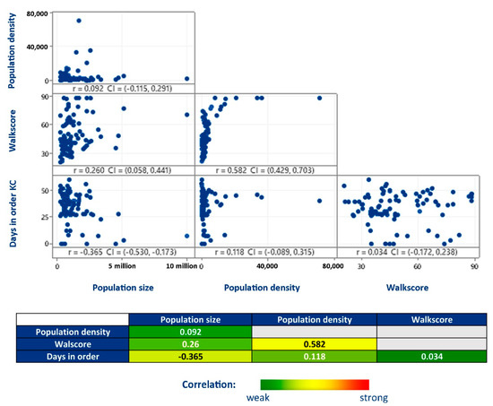 In order to quantify the degree to which our independent variables are related and avoid biasing the models, we performed a correlation analysis considering all the addressed independent variables before running the best subsets regressions (Figure 5). Although walk score and population density present a correlation coefficient (r) of 0.582, indicating a moderate positive relationship (when 0.3 < r < 0.7), there is no strong relationship (when r ≥ 0.7) between any of the predictors. These correlation thresholds that supported our interpretation were applied together with graphical analysis and are broadly accepted guidelines for interpreting the correlation coefficient [49,50].