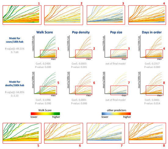 Thus, our regression analyses positively correlated deaths per 100 k habitants and all independent variables. It means that as walk score, population density, and the number of days in stay-at-home order increases, these COVID-19 related numbers tend to be higher. Figure 7 depicts the evolution of cases and deaths per 100 k habitants through time, relating these numbers to each predictor and comparing the models for the number of cases and the number of deaths. Although it might seem controversial that the number of deaths increased with the number of days at home, our time-lapse sample, which intentionally addressed the initial stages of the spread, makes it reasonable to assume that places with higher disease spread adopted more robust measures as a reaction. Containment measures have a timing aspect that influences their performance. According to [53], the benefits of a lockdown are seen around 15–20 days before the peak of the epidemic, providing a limited window for public health decision-makers to mobilize and take full advantage of lockdown as an NPI.