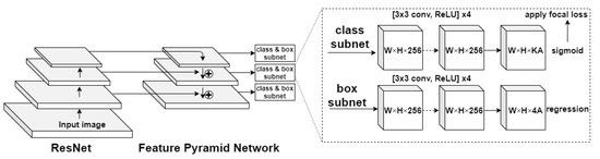 RetinaNet is a one-stage detector that uses focal loss, whereby the lower loss is contributed by negative samples. The loss is concentrated in problematic samples, which improves the accuracy of prediction. With ResNet and Feature Pyramid Network (FPN) as the backbone for extraction of features and two task-specific subnetworks used for classification and bounding box regression, the formed RetinaNet achieves excellent performance and outperforms Faster R-CNN—the well-known two stage detector [27,28].