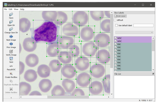 Before starting the network training process, we marked manually three types of cells in microscopic images using the LabelImg application, which is a graphical image annotation tool [34]. This process is shown in Figure 3. The objects in the images are divided into three categories: WBCs, RBCs, and platelets are marked accordingly. In this way, the annotations of blood cells were acquired for DNN training.