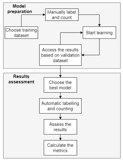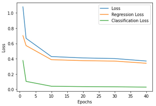 As a result of the training of each of the models, we obtained 40 files for each epoch. Then, we selected the results with 10, 15, 20, 25, 30, 35, and 40 epochs to investigate the impact of decreasing loss function on the detection accuracy. The workflow of the network learning process is presented in Figure 4.