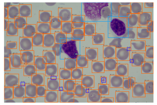 To visualize the operation of the proposed labeling and blood cell counting method, we presented one of the images from the validation set. Figure 6 shows an original blood smear image, and Figure 7 shows the same image with automatically drawn bounding boxes, labels, and probabilities of each marked blood cell. It was returned by our application using the RN30 model with the confidence threshold of 0.35. Recognized cells were automatically marked on the bounding boxes according to their type. Orange bounding boxes mark RBCs, light blue mark WBCs, and dark blue mark platelets. It is seen in Figure 7 that WBCs and platelets are detected without error. Almost all RBCs are correctly labeled. However, three erroneous orange frames are also noticed, which includes a part of two neighboring RBC cells.