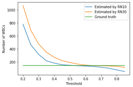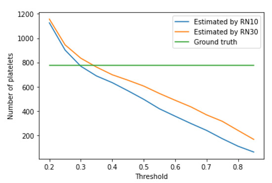 For the RN10 model, the optimal confidence thresholds determined based on Table 4, Table 5 and Table 6 are as follows: 0.25 for RBCS, 0.60 for WBCs, and 0.30 for platelets. Thus, the thresholds in the counting of WBCs and platelets in the RN30 model are higher and increased as a result of learning the RN10 for another 20 epochs. Higher confidence thresholds give greater certainty of correct recognition of individual blood cells.