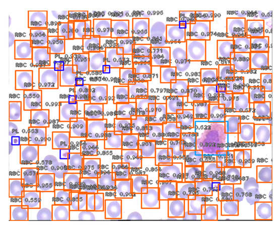 Figure 11 and shows the original image from the testing dataset. It was processed by our application, which automatically drew the bounding boxes, labels, and probabilities of each marked blood cell. An image processed using the RN30 model with the established confidence threshold of 0.45 is in Figure 12. Labels have determined colors, relevant names, and a probability value for each blood cell. At an established confidence threshold of 0.45, the WBC was correctly recognized and all platelets have been correctly recognized, labeled, and counted. The vast majority of RBCs are recognized and labeled correctly. At this confidence threshold, the RN30 model counts RBCs with an accuracy of about 75 %. It is seen in Figure 12 that there are only a few unchecked RBCs (typical for this threshold value), especially the RBCs that are overlapped or trimmed near the edge of the image. The application correctly recognized and counted one WBC. It also correctly recognized and counted 9 platelets and 123 RBCs when the ground truth is 135. The application also returns the probability values of each marked cell and the average probability of all recognized cells depending on their type. In this case, the average probability for WBCs was 0.905, for RBCs it was 0.875, and for platelets it was 0.784.