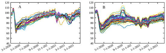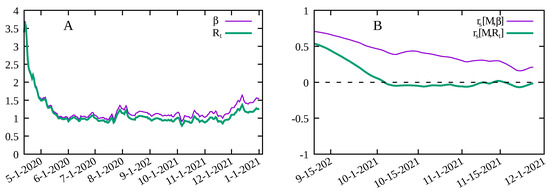 In order to quantify and qualify the degree of social distancing and its effects, some different approaches have been proposed: by survey questionnaires in the population in order to assess adherence to social distancing and to compare it to the growth of cases, or deaths [12], or by using mobility data from different sources [13,14,15,16,17,18,19]. In the latter case, a mobility or social distancing metric is compared to the growth rate of cases (or deaths) of COVID-19, or to the effective reproduction number . As we discuss below, this introduces a limitation in the analysis due to the fact that the interpretation of both the growth rate and at the beginning of the pandemic, when most of the population is still susceptible to the virus, is different to that at latter stages, when a non-negligible proportion of the population has already been infected, or has already been vaccinated. A more informative parameter, that better represents information on the circulation of the SARS-CoV-2 virus, is the average infection rate , which is proportional to divided by the proportion of the susceptible population (see Equation (3) below). This explains particularly the result by Gatalo et al. [20] who obtained a strong Pearson correlation between phone mobility data and COVID-19 growth rates at earlier stages, but a weaker correlation at later stages, for 25 counties in the United States.