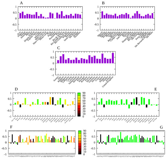 Spearman’s correlation index between the social distancing metric M and the infection rate for: (A) Brazilian states; (B) Main Brazilian municipalities with population over 750 thousand; (C) 22 European countries; (D) US counties with at least one million inhabitants. (D) Main counties in the United States. Bar colors give the proportion of days with a mask mandate since the beginning of the pandemic in each location, up to 20 December 2020; (E) same as (D) but considering only the period with a mask mandate. States without a mask mandate in the period considered are marked in black. (F) Same as (D) but for all American states. (G) Same as (E) but for the American states.