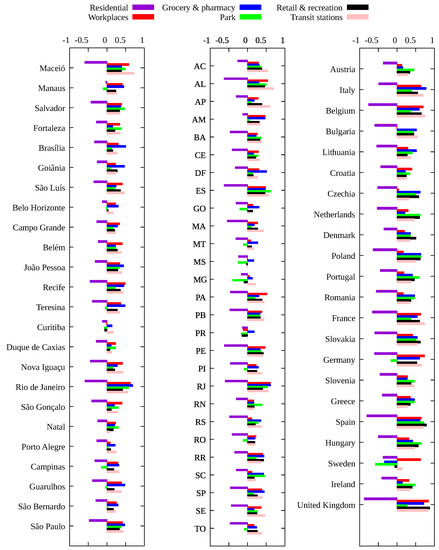 For Brazil and the European countries, the results for Spearman’s correlation are quite similar: the variation in time spent at residence is negatively correlated with the infection rate, i.e., the more time spent at home the smaller the value of , while other categories are positively correlated. For the United States, due to a much greater variety of mitigation policies implemented [13], we see a slightly different picture. In general, time at residence is negatively correlated with while time at workplace is positively correlated with the transmission rate, as expected. For the remaining categories (grocery and pharmacy, park, retail and recreation and transit stations), we observe both negative and positive correlations according to the locality, indicating that the most relevant categories are those related to the increase of time spent at home and the decrease of time spent at work places. For the United States case, there is a significant increase in the value of when considering only the time period with a mask mandate, which indeed shows its effectiveness.