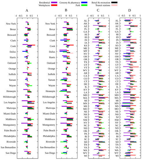 Spearman’s correlation index between changes in each mobility category and the infection rate for (A) counties with more than one million inhabitants and one thousand deaths for the period from the first COVID-19 case up to 20 December 2020; (B) same as (A) but for the period with a mask mandate, except those counties with no mask mandate in 2020 (marked in black in Figure 3E), for which the whole period is considered; (C) same as (A) for all US states; (D) same as (B) for all US states.
